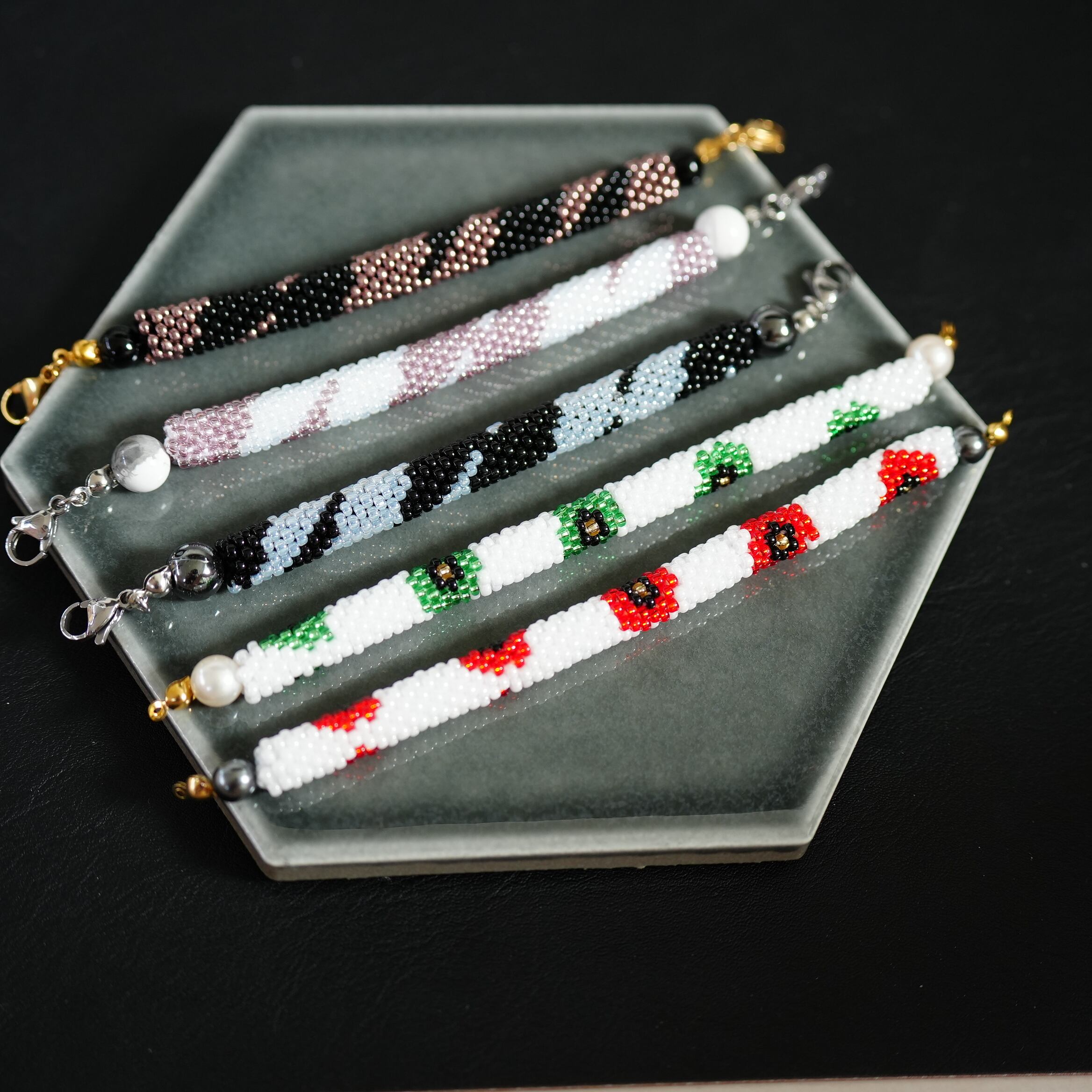 - 素材: ビーズ(国産ブランドビーズ)、レース糸(国産オリムパス)、カニカン(サージカルステンレス)、つなぎ金具(合金)、天然石(オニキス)
